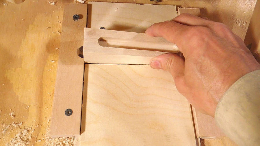 pushes a piece of plywood against the workpiece. The piece of plywood