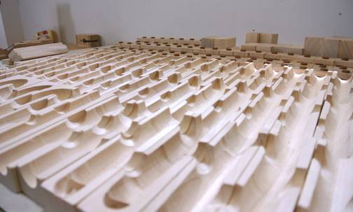 The riser blocks need to have a step, because the next ramp that the marble rolls onto is always one height increment lower.