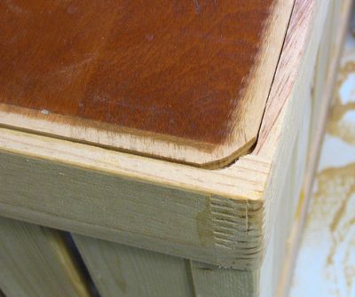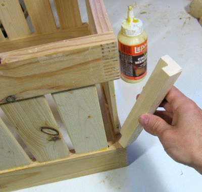 The corners aren't really there to hold the box together, more to keep long items from poking out of a gap in the corner of the box. My original idea was to make the slats extend to the corners, but that would have been tricky in terms of all the alignment, especially while pounding the whole thing together. Plus, I think these bigger corner pieces look better