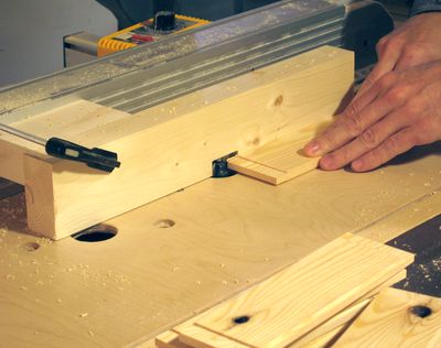 To make the vertical slats for the boxes, I used 2x6 lumber, and ripped it down the middle. With the resulting piece being 38 x 60 mm, I was able to resaw three slats out of this by putting the piece upright on the table saw, and cutting in from both side using a very thin skillsaw blade. After planing, I still had slats that were 10 mm thick.