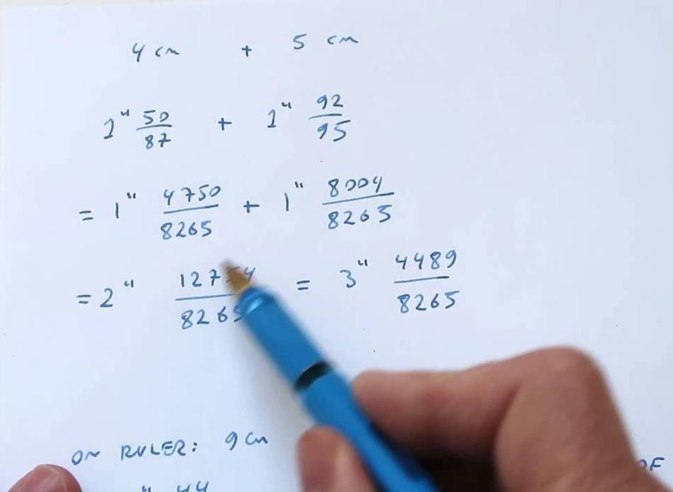 We have 1" 50/87 + 1" 92/95 Which is very close to the fraction at 9 cm, in fact, its within 0,000076". But that's using a decimal fraction, which is cheating. Its within 1/13126 of an inch. Doing arithmetic with this scale, is even more fun than doing it on a regular fractional inch scale. cause why else would you use use inches? Some people like the mental challenge, why else do Just like people like doing soduku or crossword puzzles.