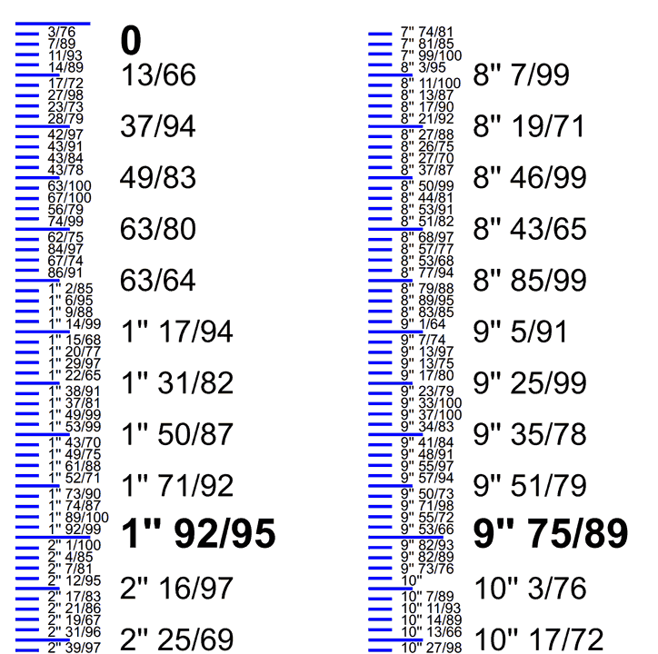 For example, what would be "1 cm" in metric is 37/94 inches. 2 cm is 68/80 inches and 10 centimeters is 3" 89/95. I originally had my computer find the closest fractions with a denominator up to 128, but 1/127" is exactly 0.2 mm, so the best fitting fractions were all in 127'th of an inch. That didn't make for interesting variety, so I limited the denominator to 99 instead.