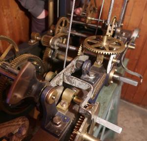 Looking at the clock mechanism, there are many clever aspects of how it's designed, such as a simple weighted lever that needs to be engaged before the winding crank can be put on the shaft. This weighted lever provides a few minutes worth of power to the clock while the weight is wound up.