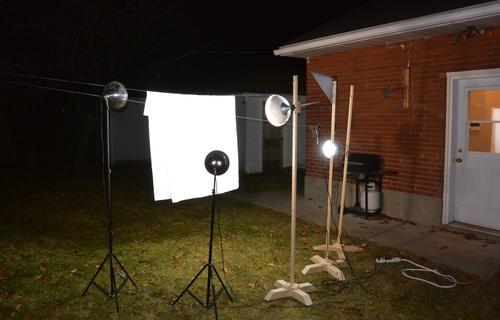 This shot at right doesn't really look like it was taken at outside at night, but it was taken with the setup at left. With enough lights at different directions, the lighting looks fairly even, even without using soft box lighting. I have a 27 watt CF bulb (equivalent to 100 watt incandescent) in each lamp, for a total of 135 watts.