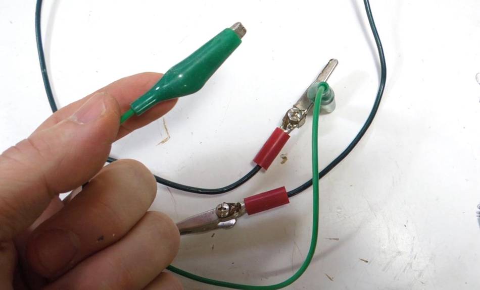Note that I'm holding the wire behind the alligator clip. Only the part of the wire between the alligator clips gets hot.