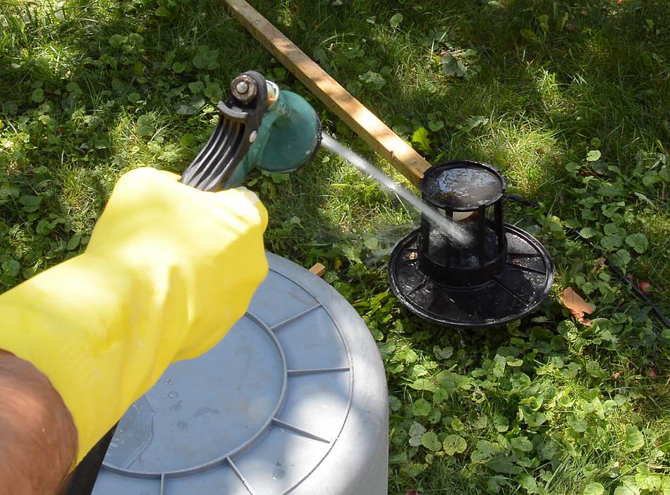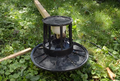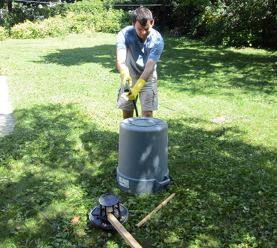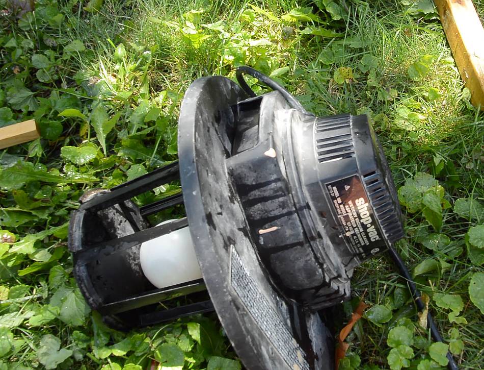 So I put the blower unit upside-down in the grass, with a piece of wood to prop up the float ball (which normally blocks the air flow vacuum if it gets too full of water). The switch on the ShopVac is in the on position so that I can start it by plugging it in.