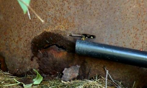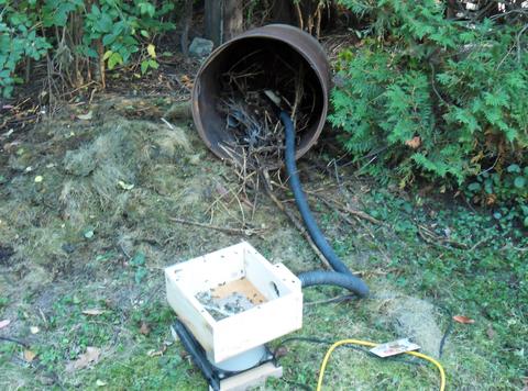 So I set up the wasp sucker again, this time with the hose near the nest to catch