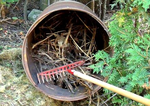 So next I tipped the barrel and started pulling at the branches inside to get at the nest. You can see the light gray "ball" shape of part of the nest in this picture.