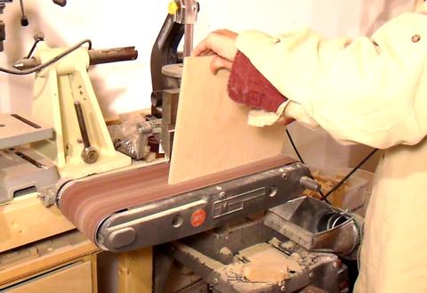 The floor slopes by about four degrees. To get the final fit, I'm sanding the bevel