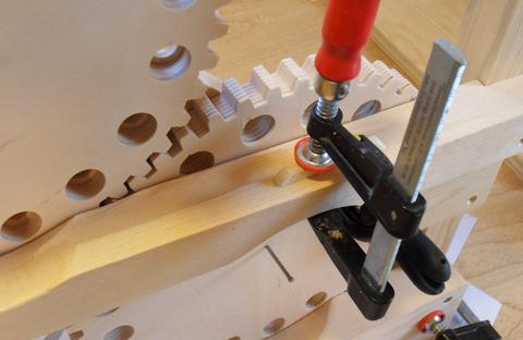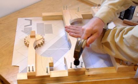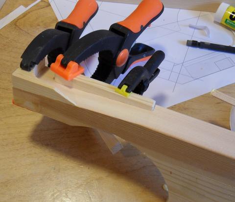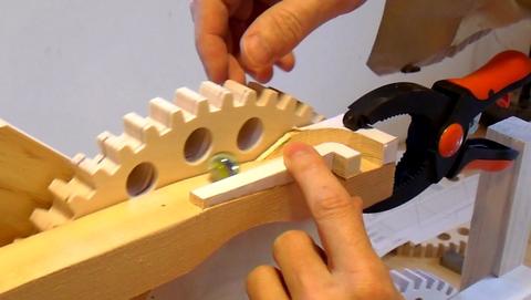 Here's gluing the guards below the rails. These guards prevent the marbles from rolling out