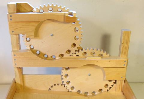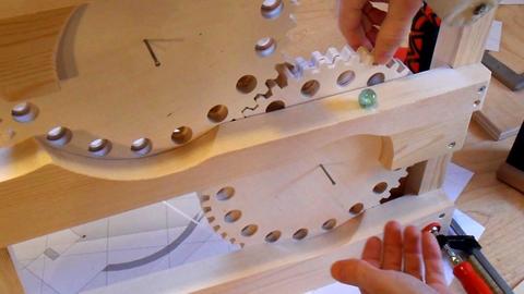 over it, so a small piece of wood is glued on across from where the marbles exit the wheel.