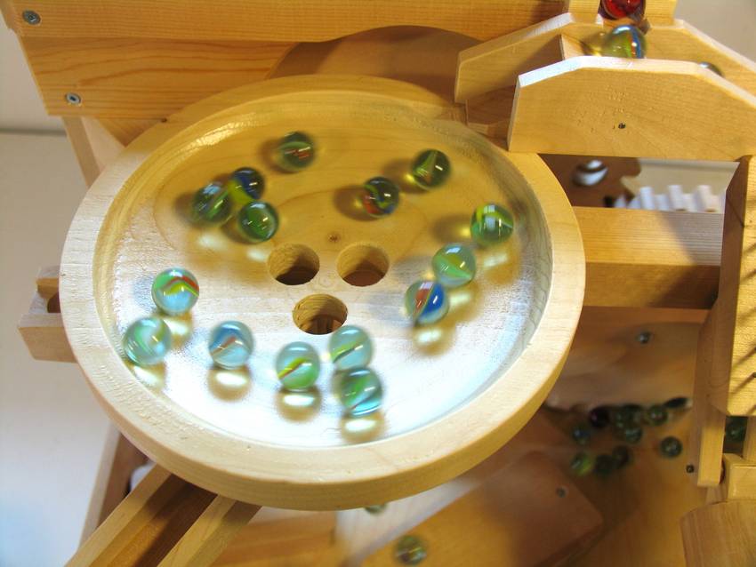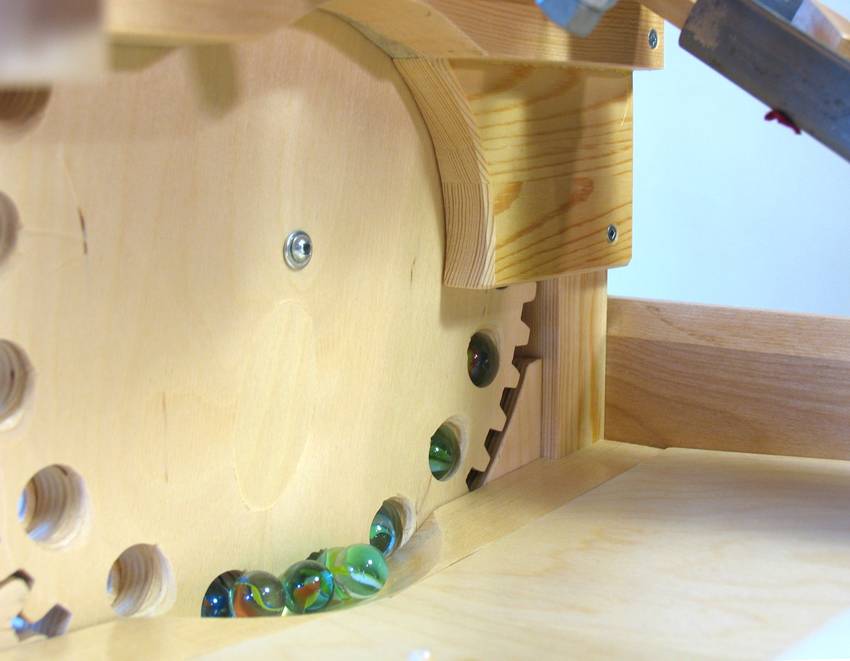 As the wheel turns, when the holes are at a half-way point the slope becomes sideways, and at the top it becomes a downward slope. So once past the half-way point up the wheel, the marbles tend to roll out of the gear. So I added a guard to prevent the marbles from rolling out before they get to the top. The floor of the machine consists of two sections of plywood, each sloped towards the pick-up point at the bottom gear. Near the gear, there is an arched and beveled contour in the floor that pushes the marbles in towards the holes in the gear.