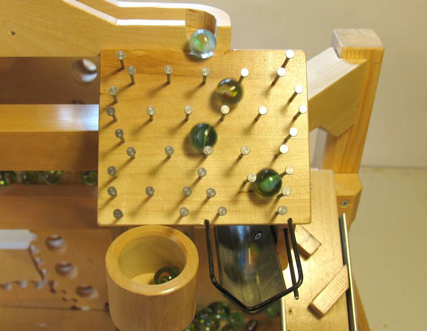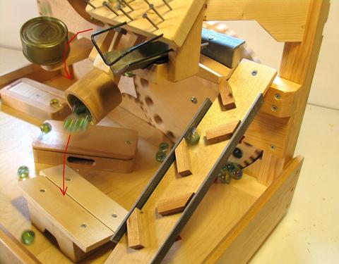 The marbles that hit the angle iron roll back, where they hit another small, loosely mounted angle iron and ramp. This deflects them onto a zigzag that has angle iron on either side. These angle irons are also loosely mounted so that they ring as the marbles hit them several times on the way down. At the bottom, the marbles shoot past the xylophone boards and eventually roll back to the gears.