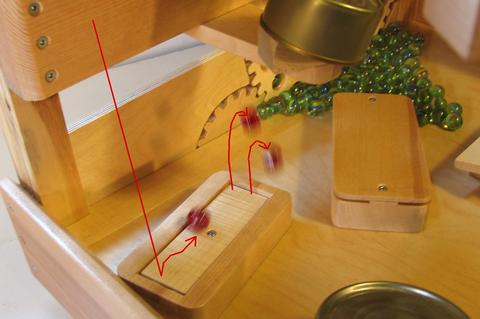 This mechanism doesn't always work perfectly. Sometimes there are two or three marbles on the end of the rocker, but usually the next marble will eject more than one of them to start clearing the jam.