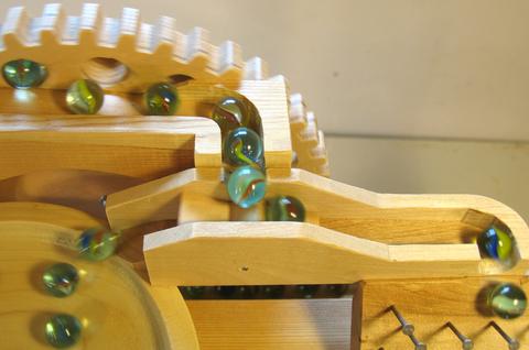 holes in them for the marbles. The small gear is coupled to the crank