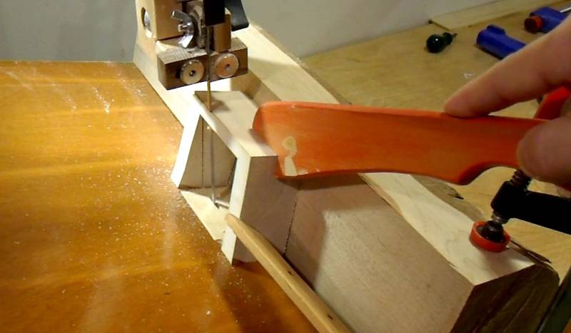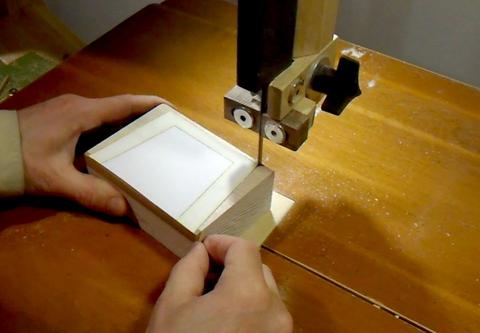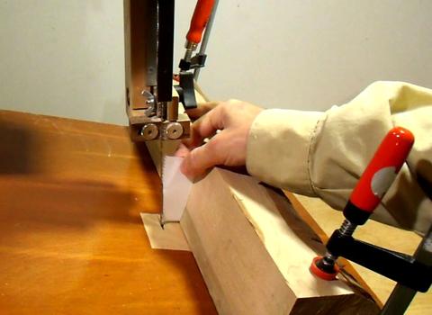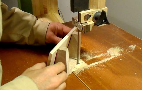 After cutting out the outline, I tilt the bandsaw table and add a fence for cutting
