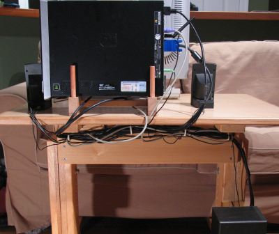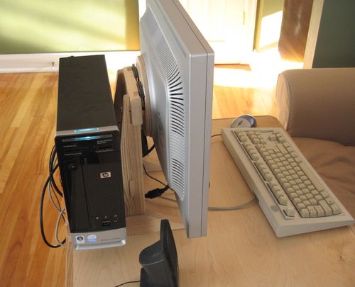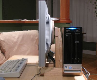 My 21" Samsung LCD monitor came with a stand that could tilt, swivel, rotate, and height adjust. Quite a lot for a monitor stand to be able to do, but at the same time, it wasn't overly sturdy. In fact, if subject to vibration, the monitor would inevitably start tilting down on its own. I ended up resorting to jamming an eraser between the monitor and the stand to keep this from happening. And I never did find a use for all those other adjustments it had. When I bought my new slimline HP computer, I figured an ideal place to keep the computer would be directly behind the LCD monitor. This would put the PC neatly out of the way. Also, although the PC is not very loud, whatever noise does come out of it, some of it would then be blocked by the monitor. But to make for a compact and secure arrangement of this sort on my wheely desk required that I build a custom LCD monitor stand.
