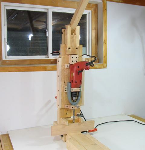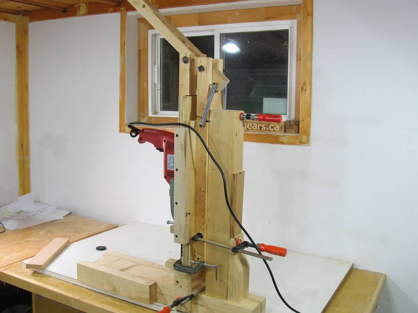 A more practical application of what I came up with might be to use that same mechanism, without the hollow chisel part, to turn a hand drill into a drill press. But then you have to weigh off the cost of a cheap drill press to that of a good hand drill, and there probably aren't any savings there either.