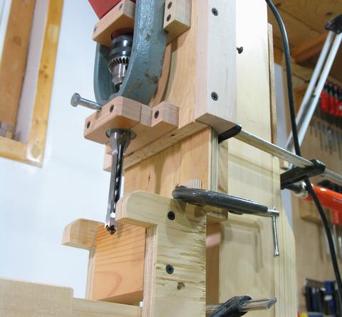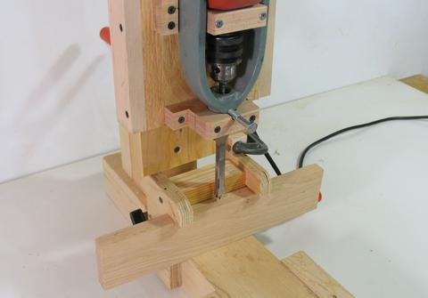 I was lucky that my drill has a bit of a hook on the back to help push it. I made a wooden block that fits exactly against the hook, and i screwed it onto the plywood with four screws. That block will take up the force on the drill. It's not overly critical, because most of the force goes to the hollow chisel, not the drill bit.