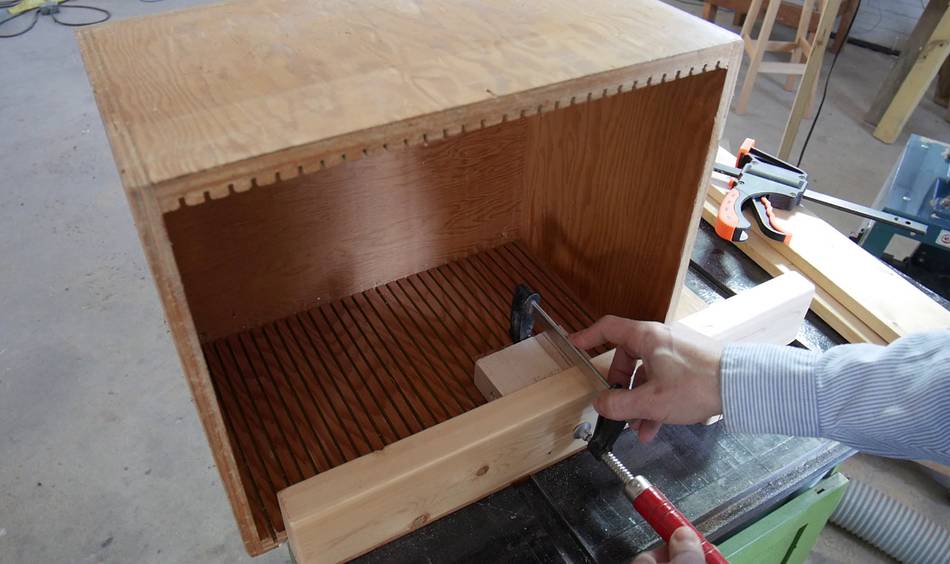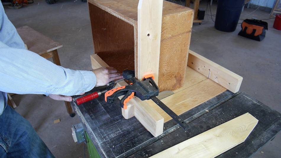 The box is pinned down on the table saw sled with a block of wood