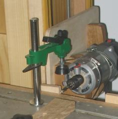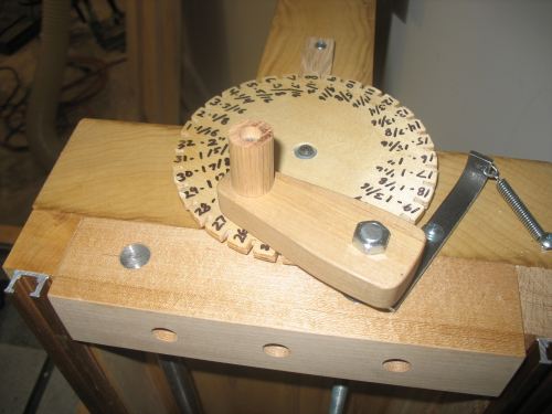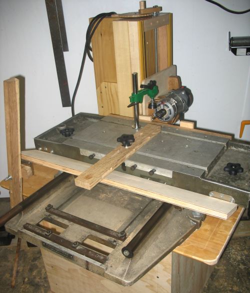 Shawn writes:Here are a few photos of the slot mortiser. The router stand is styled more from a milling machine setup rather that the box type that you used. Since the mill-drill table handles the X-Y movement I really needed to have the router stand tall and very solid. I used a big chunk of poplar that has been kicking around in my shop for 15 years. The lift mechanism and counter mechanism you will obviously recognize from your application. The lever handle system is still a work in progress. The area on the router side of the table was too confined to place the handle there. As in your multi-slot mortiser that is a more ideal location to keep it out of the way of the stock being mortised. However, mine is far enough away that it shouldn’t be a problem. I used inexpensive steel door hinges to simplify the building process of the handle components. It’s not as pretty, but it will work just fine. I still need to tweak a few things with it and then finish it down to a more aesthetically pleasing final form. I used your idea for lateral stop blocks mounted under the table. For some reason I was all worried about drilling into the table. Once I got over that I was able to get a lot done rather quickly.