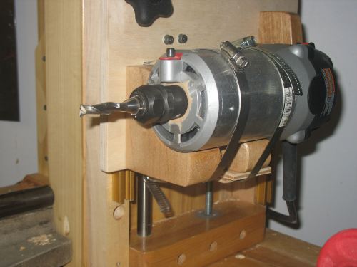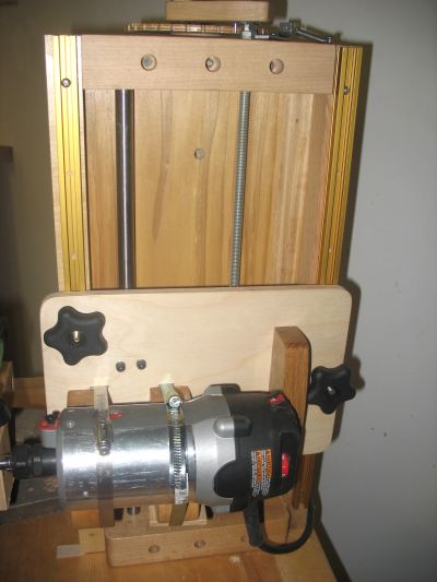 I had a problem with chatter while routing into hardwoods. I realized that the linear rod bearings had a slight vertical play in them, and that I would need to add a locking mechanism to the front. I wound up with one in front and one on the back. So far it seems as though only the one in front is necessary for actual use. The use of a birch plywood plate as a router base with maple block supports worked nicely. I went through two prototypes before making all the necessary adjustments.