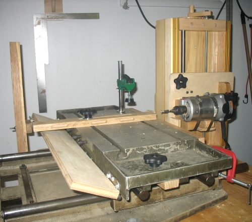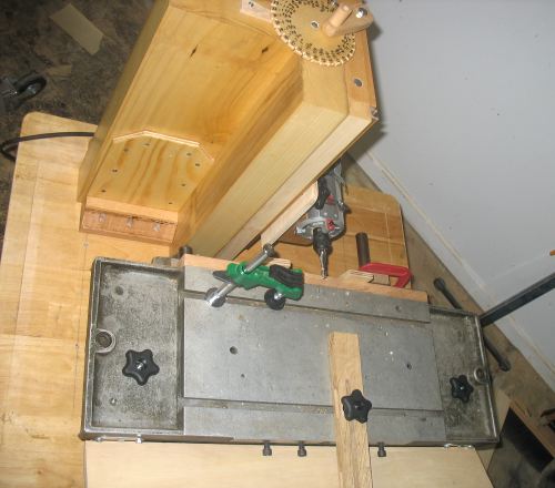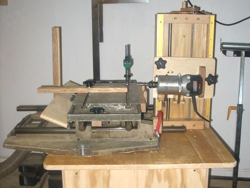 Shawn Havens' mill-drill table based slot mortiserShawn Havens sent me some picture of his slot mortising machine that he built using the same model of Thomson mill-drill table that I used for my first mortising machine and later turned into a horizontal boring machine. The Thomson mill-drill table is really quite a gem for the basis of a machine, and if you ever find one for sale, consider buying it!Shawn's machine incorporates elements of my slot mortising machine for the vertical adjustment, but relies on the mill/drill table for horizontal motion.