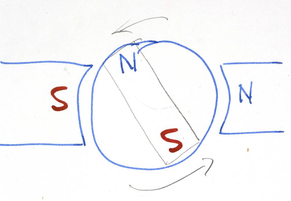 Here I'm applying a current, using thin telephone wires pushed against the commutators and checking the magnetic field with a compass. If I change where I'm applying the current (to different commutators) them magnetic field also rotates to line up with the commutators I'm applying current to.