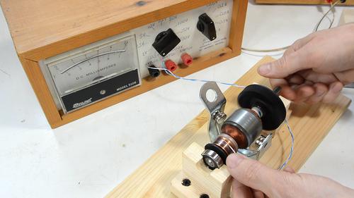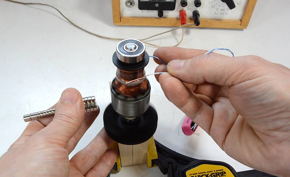 Next I applied 30 volts to the rotor, and that got it spinning scary fast, considering it's just sitting loosely in this arrangement. But universal motors, in real operation, usually run at about 100 to 200 turns per second.