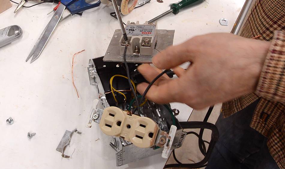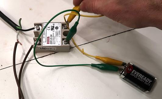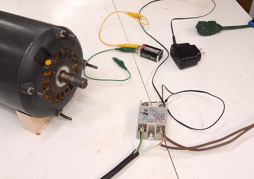 I used a solid state relay (Imitation Fotek, $3 from china). The relay needs 3-24 volts DC to activate and can switch up to 25 amperes AC. A 9 volt battery works fine to activate it, as does an old 5-volt cell phone charger AC adapter. The cell phone charger adapter can also run off 240 volts so it's perfect for the job. I tested it on the workbench using a motor that came from this machine.