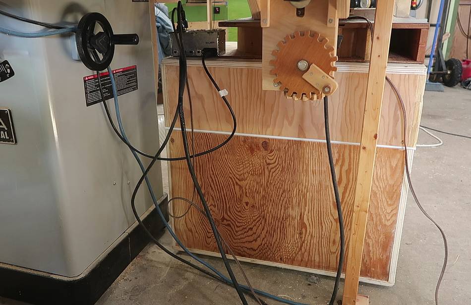 I don't have any convenient power outlets near the table saw, so I put a long power cord on the relay box. The extension cord function will come in handy for plugging in other tools.
