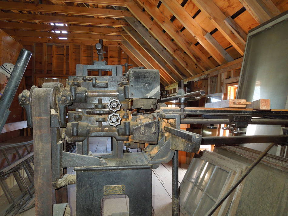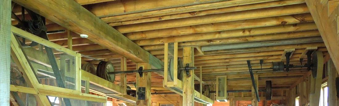 An old (not quite turn of the century) diesel engine powers the overhead shafting.