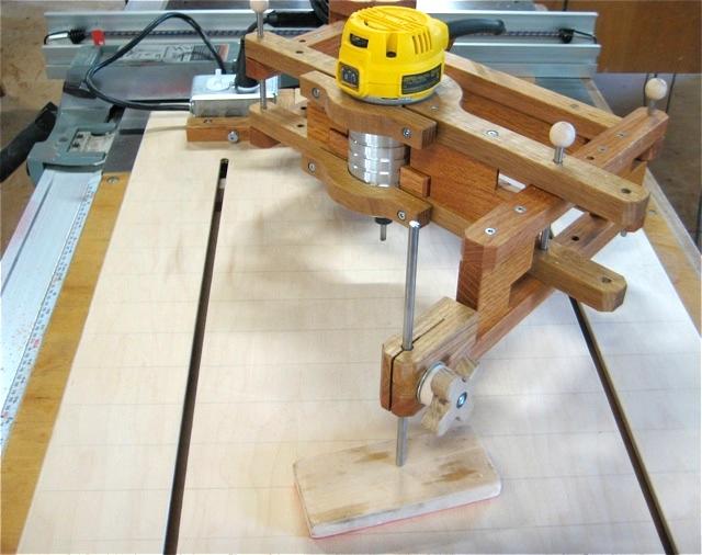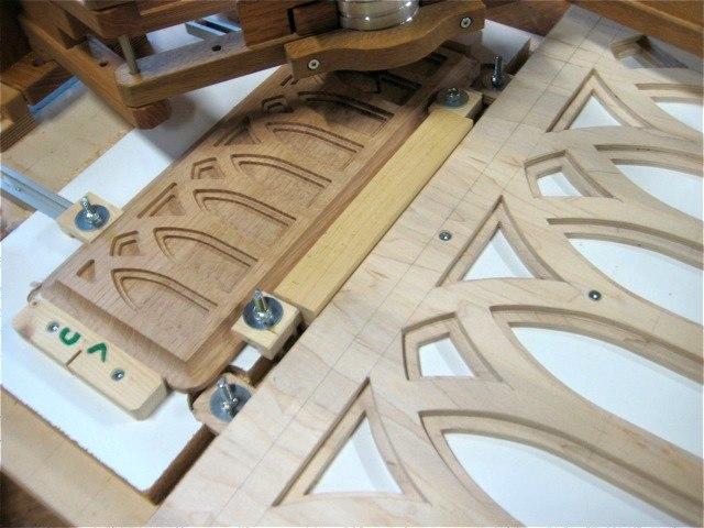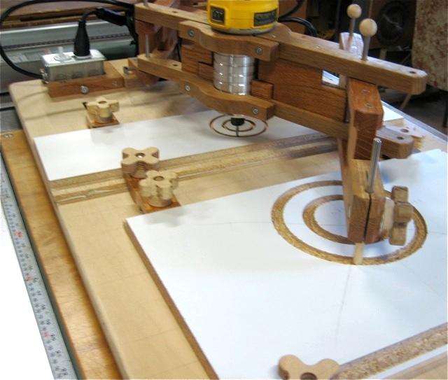Matthias, Thank you for the pantograph plans. They are reasonably priced and, although I could have worked it out on my own, sometimes it's nice to have someone do the "heavy lifting." I know you recommended plywood spans, but I had some nice qtr sawn oak I preferred to use, so the whole thing is that. Well, except for the base and the main pivot base. Here are some early shots: basic machine, test for accuracy with circles, and beginning of my first project. Thanks again, Ken