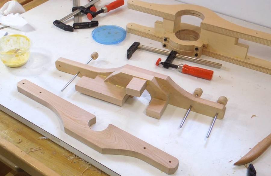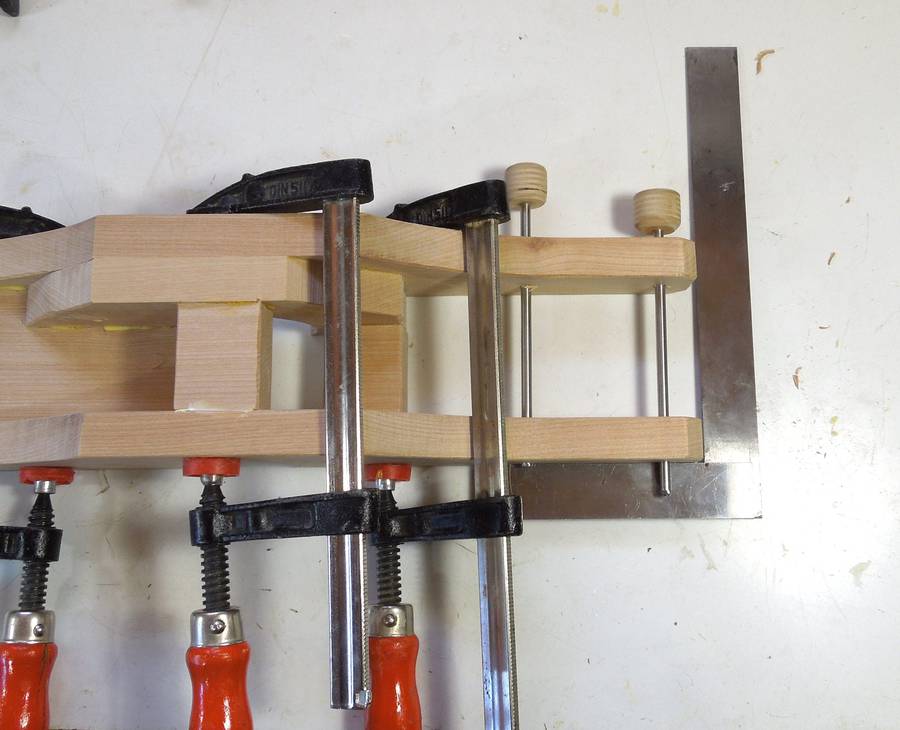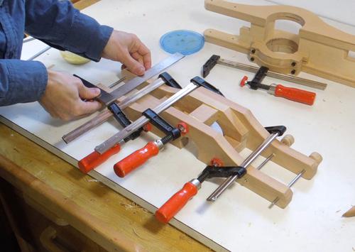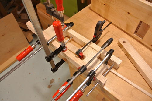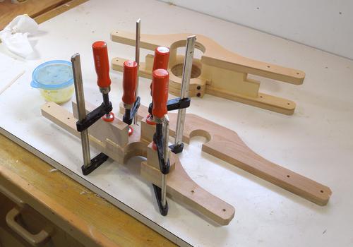Gluing up one of the links for the pantograph for Pat. I had the idea of clamping it all to my workbench