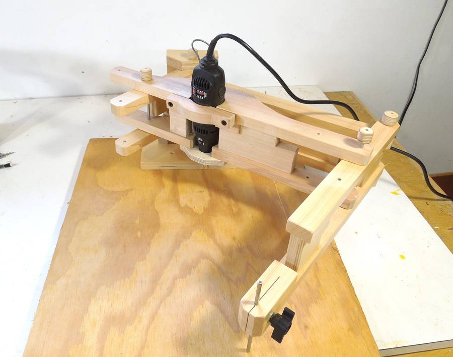 I also made the mount out of regular hardwood (not plywood). I don't recommend solid wood for a router mount, but for a mount as light and narrow as this one, solid wood will do.