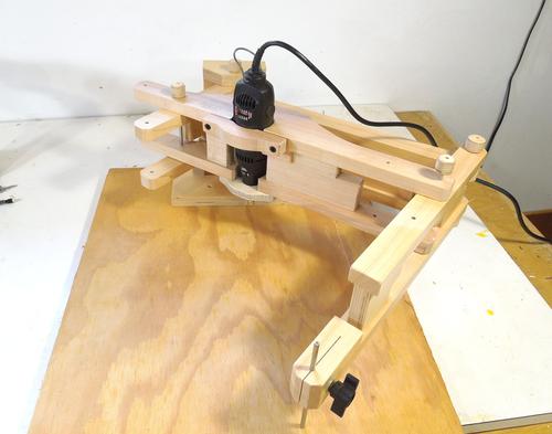 In retrospect, because I held the front of the Dremel with just a piece of plywood, I could have just made that part large enough to span the larger opening in my existing router mount. That would have saved a bit of time. But I ended up building a whole second pantograph, so the effort wasn't wasted.