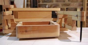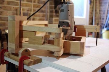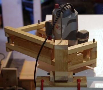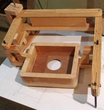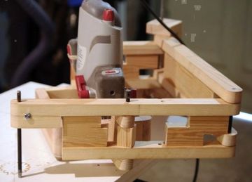 Using a plunge router for a pantograph does involves some compromises. The large mount for the base collides with the links at too large or small an angle, which limits the range of motion. also, the base needs to come quite far down, which makes it difficult to see the work in progress. In fact, this pantograph is in several ways "upside down" with respect to my design because the base mounting box needs to be quite low. Click any image below to enlarge