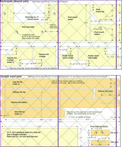 1:1 printable templates There are 1:1 printable templates for many of the parts. These are useful for checking part sizes by placing them on the paper, or for some parts, pasting the template onto plywood for cutting out. The templates are segmented so that they can be printed on a regular letter or A4 size sheet. The diagonal grids make it easy to align the images when pasting them together.Also incuded are contiguous images that can be loaded into the free eval version of BigPrint, which, on recognizing the images, will act like the full version while that image is loaded.