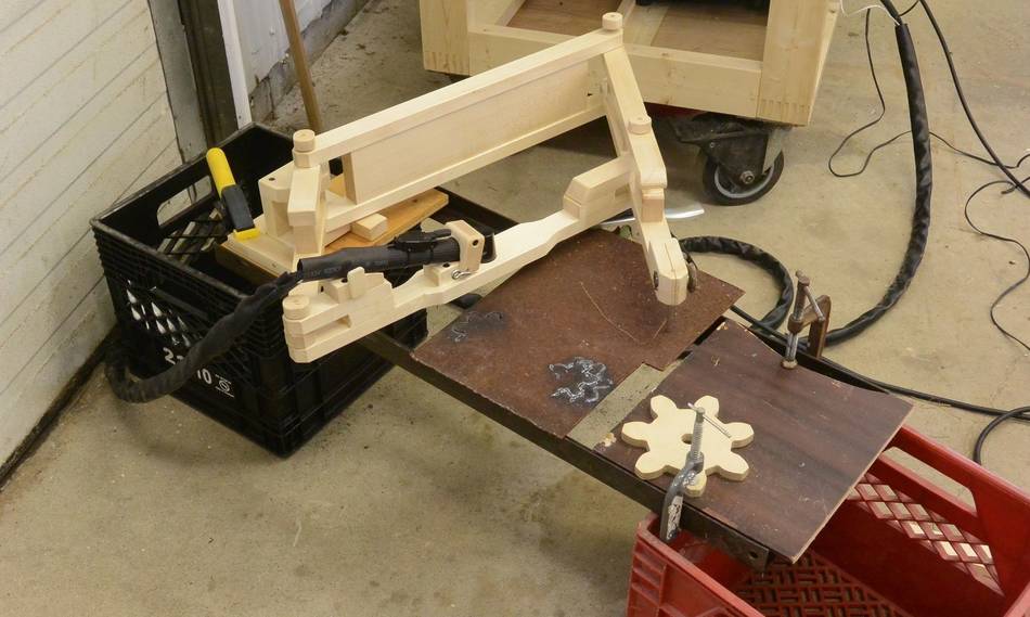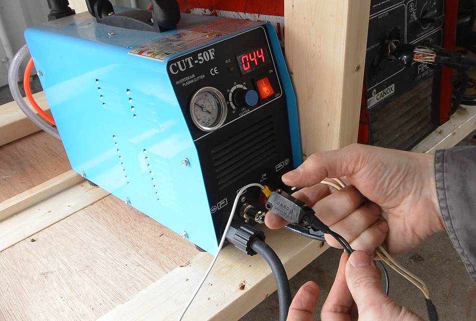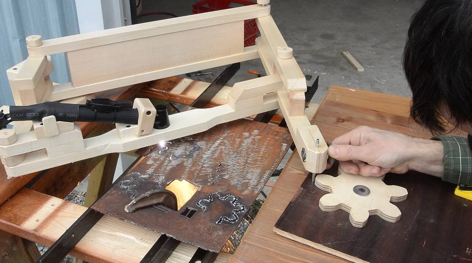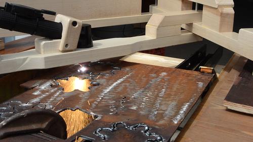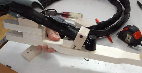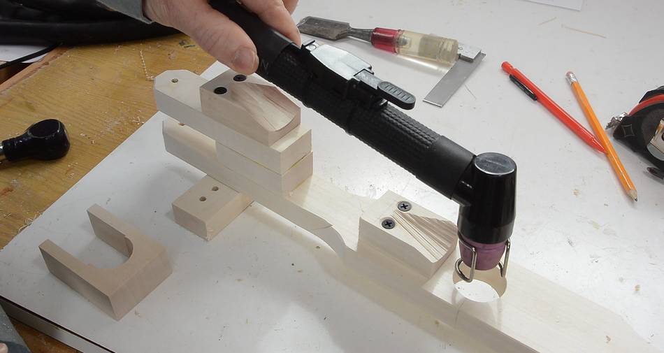 I made some blocks with an angled notch to cradle the handle of the plasma torch