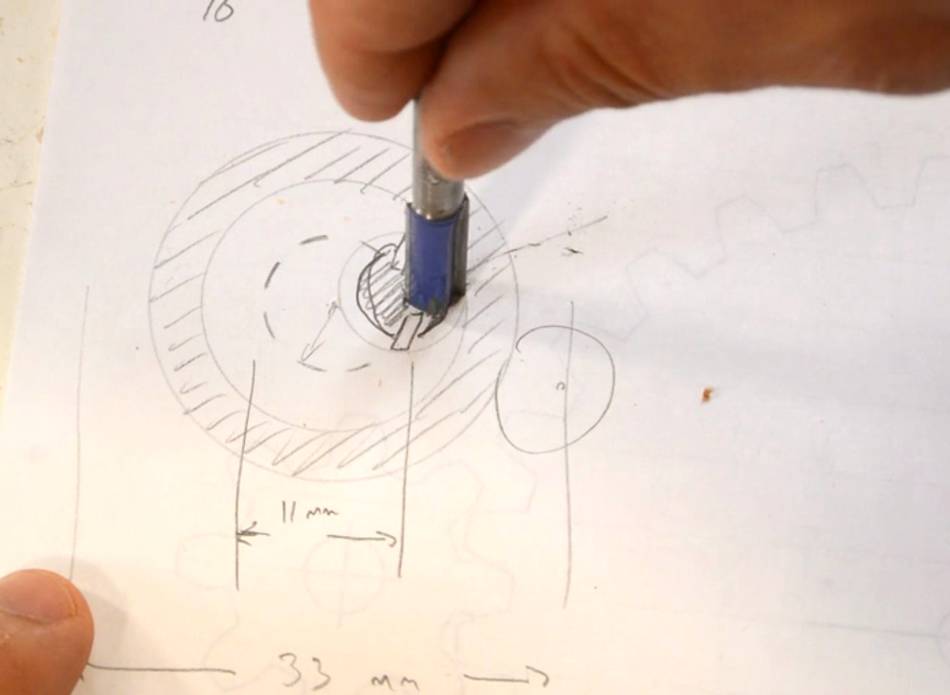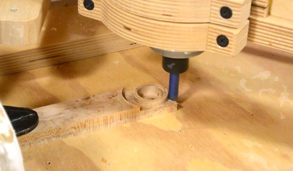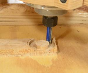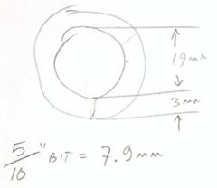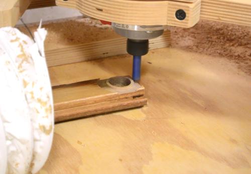 For the inside, the router needs to sweep around a circle that is one router bit diameter smaller than the inside diameter desired, and on the outside, the diameter of the router bit needs to be added. I wanted a 19 mm inside diameter, and 3 mm thickness, so 25 mm outside diameter. This worked out to the router moving in circles of 11 mm and 33 mm diameter.