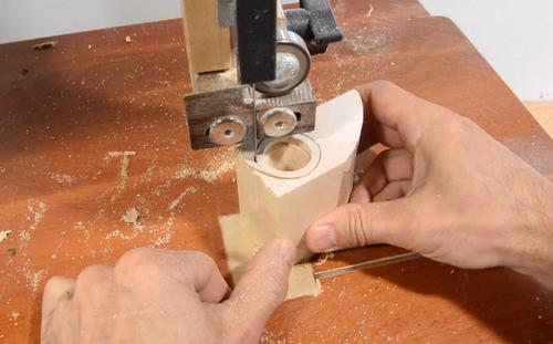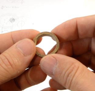 I started by drilling a hole slightly larger than the ring, and inside that a much deeper hole, about 3 mm smaller. I then cut around the hole on the bandsaw...