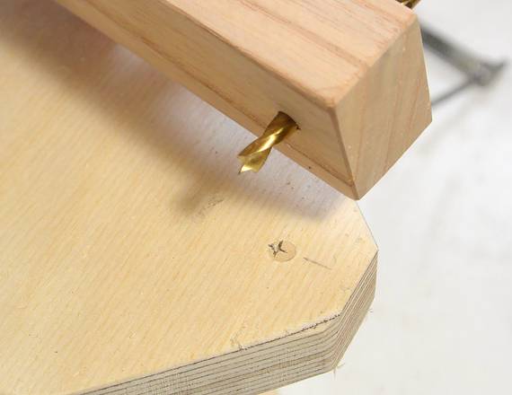 So I drilled a hole in another piece of hardwood with the drill I wanted to use. I then stuck the drill bit in that hole, with just the middle of the drill's points protruding, and placed that point in the divot. I then firmly clamped the piece of wood in place.