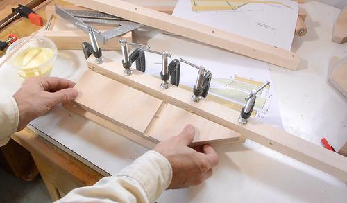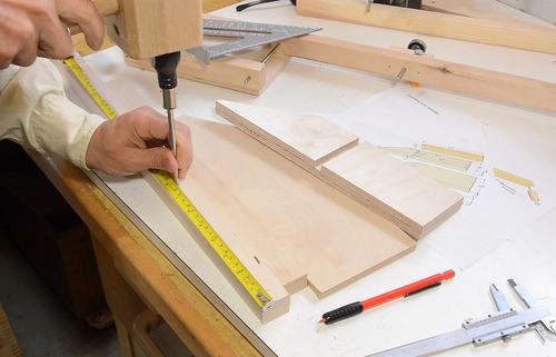 But I also had the hole for the follower slightly crooked, the long part of the link wasn't stiff enough to resist twist flexing where the follower mounts. So I redesigned the operator handle link (drawing on the workbench) and started building a new one.