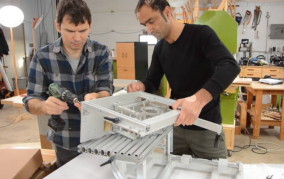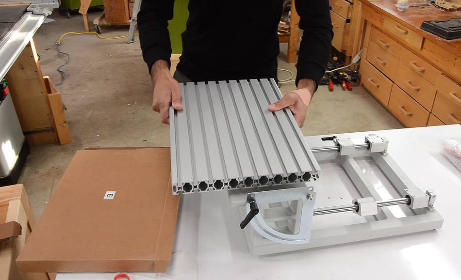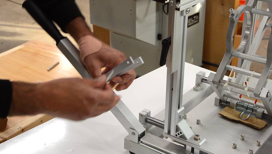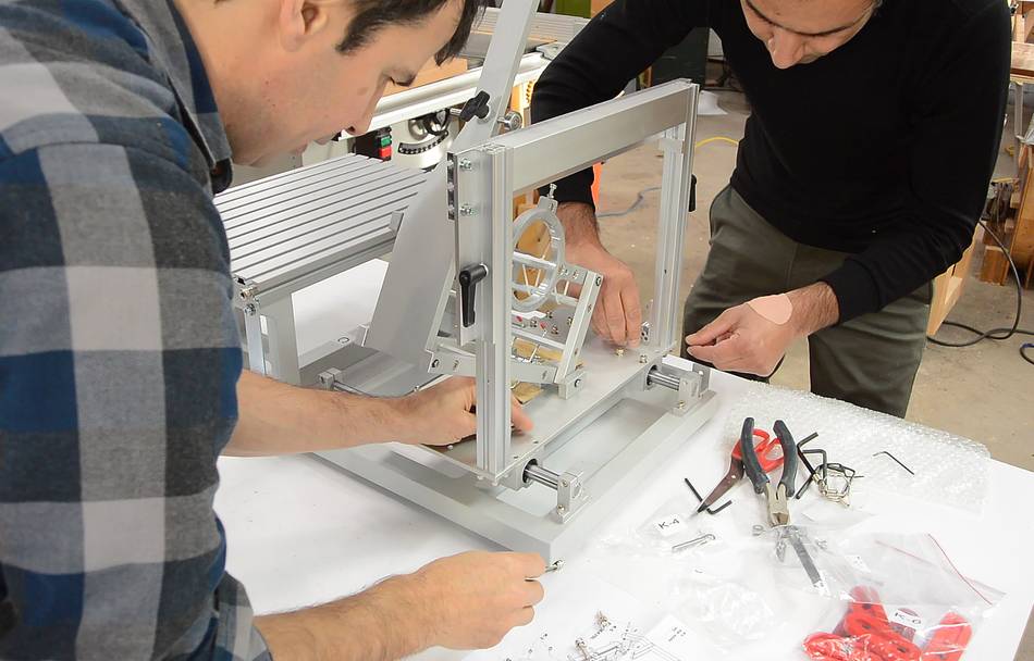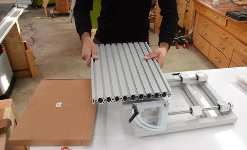 Here Kuldeep is adding the table. The table supports and angle adjust protractors were already mounted to the base in the box.