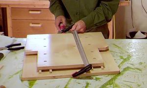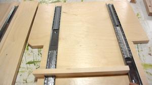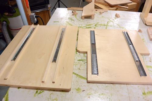 But with the wooden dust guards on the base, I can no longer put my spacers against the rails in the base, so I ensured the rails in the sled were aligned (image at right), and left the screws in the base loose to let those rails align with those.