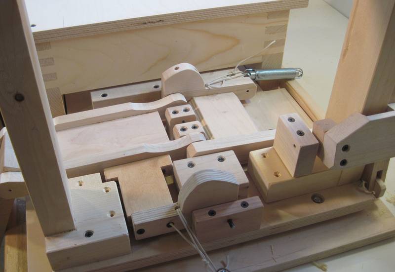 I experimented with using two springs on each side, one inside the other. I had originally calculated the spring force and cams to compensate for just the weight of the router, but then added the second spring to also compensate for the weight of the wooden mechanism. The two springs overcompensated, so the router always ended up at the top of its range of motion unless I pushed down on the handle. While this was comfortable to operate, it was awkward when mounting templates because the router would always be in the way. So I took the second springs out so that the router normally rests on the bottom.