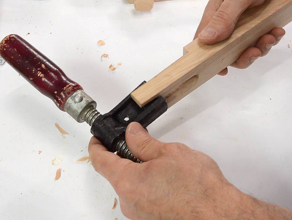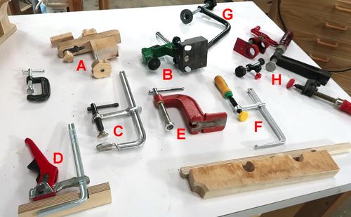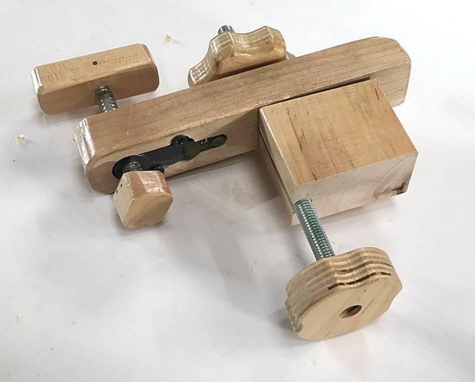 F Dovetail slot clamp, which fits in dovetails milled into a piece of wood.