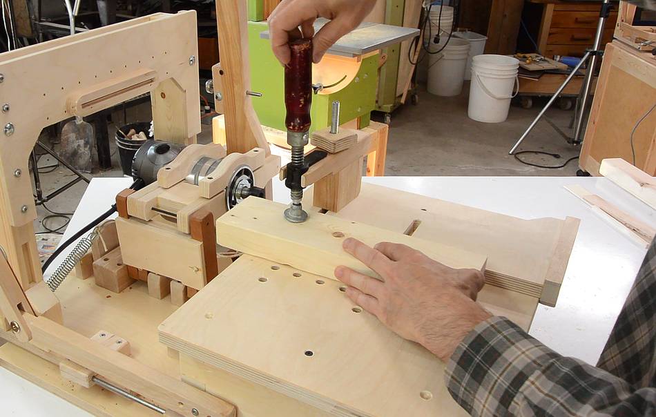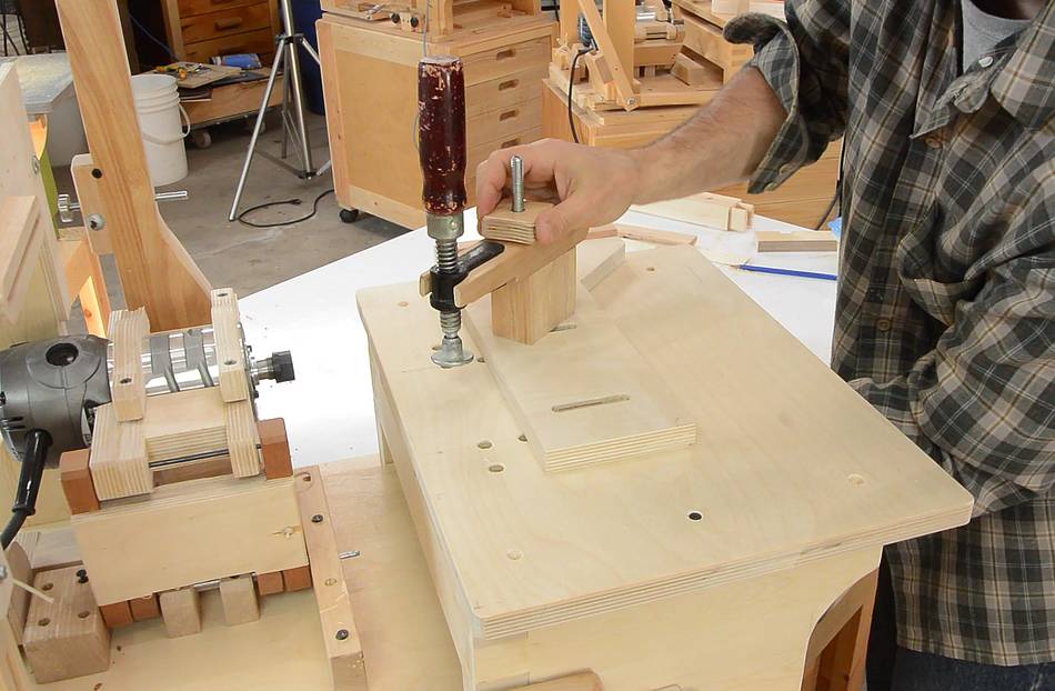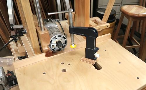 B Hold down clamp for the metal pantorouter. Works nicely, but doesn't press down hard enough, so I also need to constrain the workpiece from moving side to side.