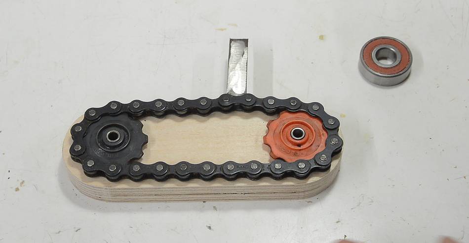 with the hook on it is between the sprockets. I added a bearing to the shaft
