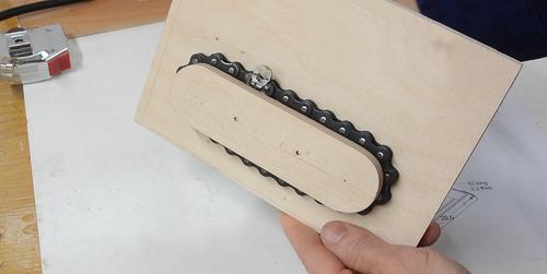 With the chain mechanism below the table, I could optimize for robustness instead of making it hidden. So I drilled a hole in the strip of metal and shortened it so it will hold the shaft near the chain.